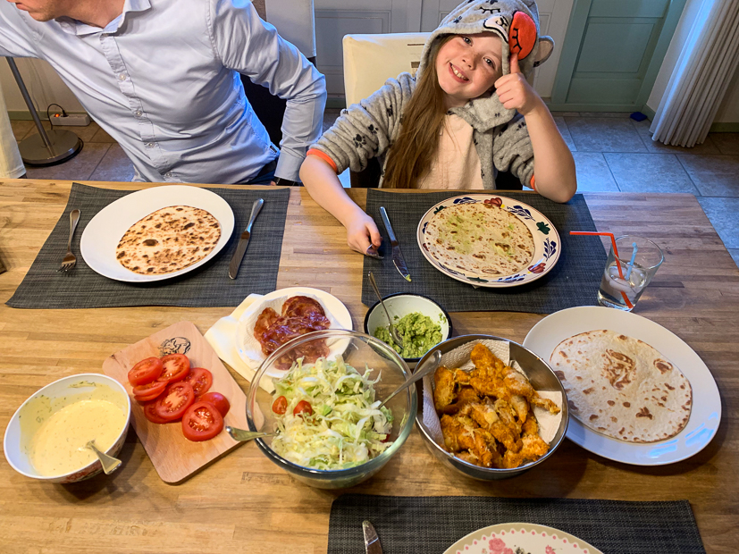 Ella-Marie en ik gaan uit school even boodschappen halen voor het avondeten. Ella-Marie mag bepalen wat we eten en kiest wraps met krokante kip. Dit recept. In plaats van kipschnitzels sneed ik zelf kipfilet in repen en paneerde ze met een zakje krokante kip van Santa Maria, maar je kunt de kip ook zelf kruiden en paneren met paneermeel of panko. Ik bakte ze krokant in de oven en bestrooide ze op het laatst met wat geraspte kaas zodat die nog even kon smelten. Ik maakte er ook nog guacamole bij. Vervolgens lekker alles uitstallen op tafel zodat iedereen zichzelf kan bedienen. Smullen maar!