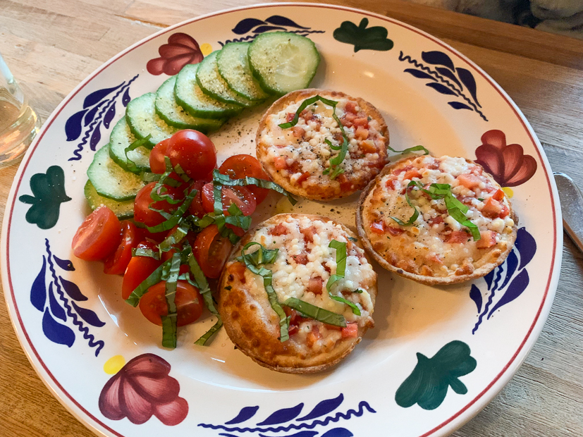Ella-Marie eet vandaag wat eerder omdat ze naar voetbaltraining moet. Ik bakte drie mini-pizzaatjes voor haar af in de oven en serveerde die met wat rauwkost erbij. Uiteindelijk vond ze de pizza niet lekker en kreeg ze nog een sneetje brood.