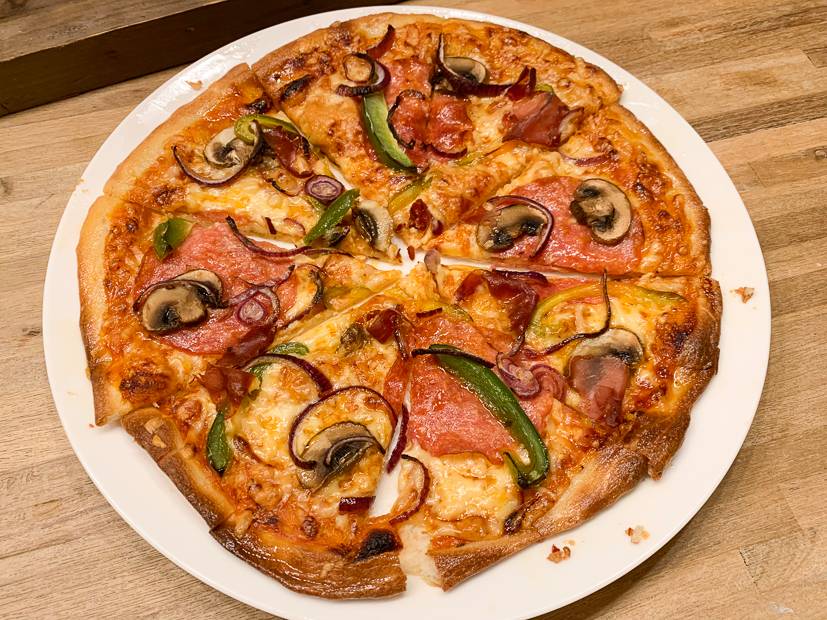 Voor Johan en mij had ik twee bollen zelfgemaakt pizzadeeg uit de diepvries gehaald en aten wij later zelfgemaakte pizza.