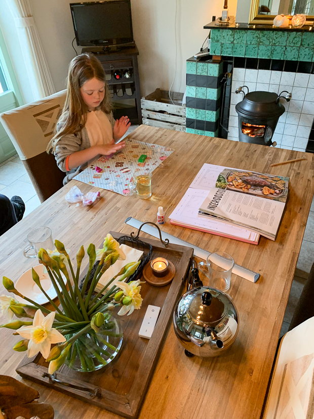 Als we genoeg hebben van de kou en de regen gaan we lekker naar binnen, trekken ons huispak aan en steken de openhaard aan.