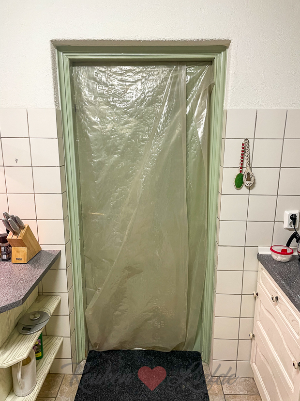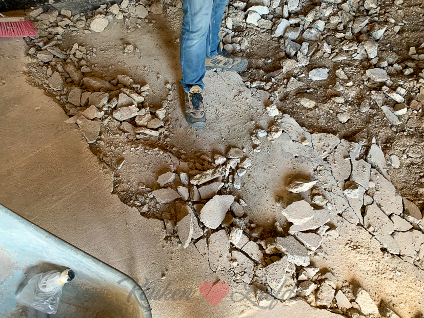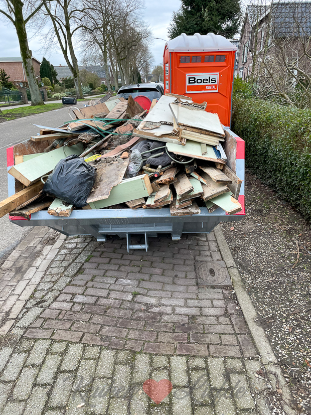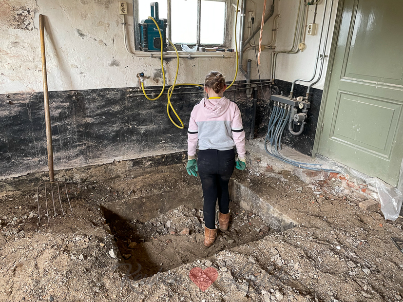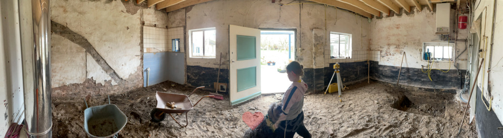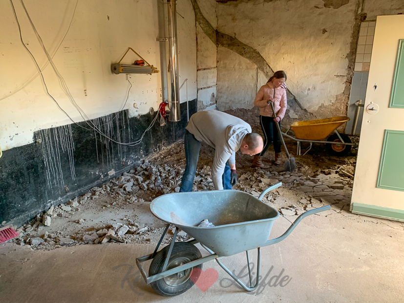 Vandaag wordt er de hele dag hard gewerkt om de betonvloer te verwijderen. De kieren tussen de deur van de deel naar de keuken maakten we dicht met plastic zeil maar helaas vindt stof altijd een weg…. ?
