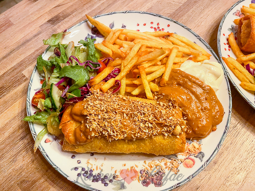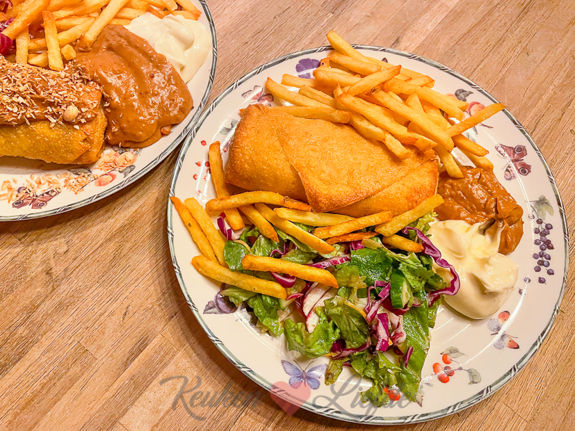 ’s Avonds eten we loempia’s uit oven met frietjes uit de airfryer en salade.