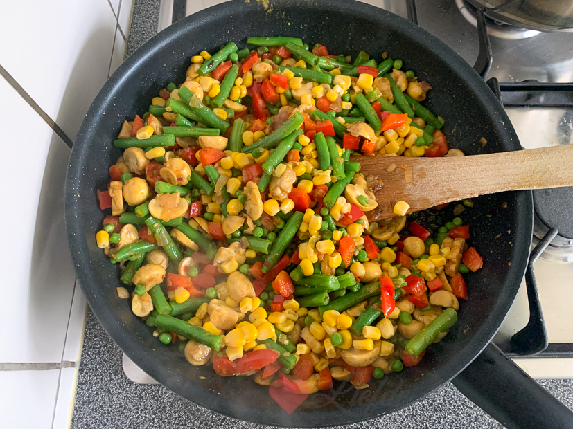 Vandaag is mijn vaste kantoordag waarop ik grotendeels dit kijkje in de keuken schrijf. Gisteravond hadden we eten uit de diepvies gehaald om te ontdooien dus vandaag hoef ik niet te koken. Ronaldo eet een kommetje bloemkoolsoep met een bolletje voordat ze naar voetbaltraining gaat en Johan en ik bakken een kliekje paella op in de koekenpan waar ik nog extra groenten aan toevoegde die op moesten. Prima maandagavondhap.