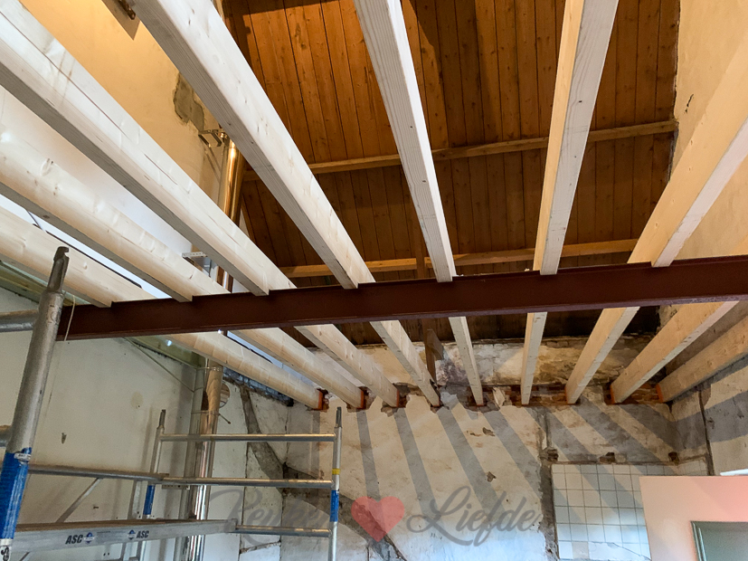 Ondertussen zitten we in de tweede week van de verbouwing. Het oude balkenplafond en de trap zijn inmiddels verwijderd en de nieuwe balken liggen erin….