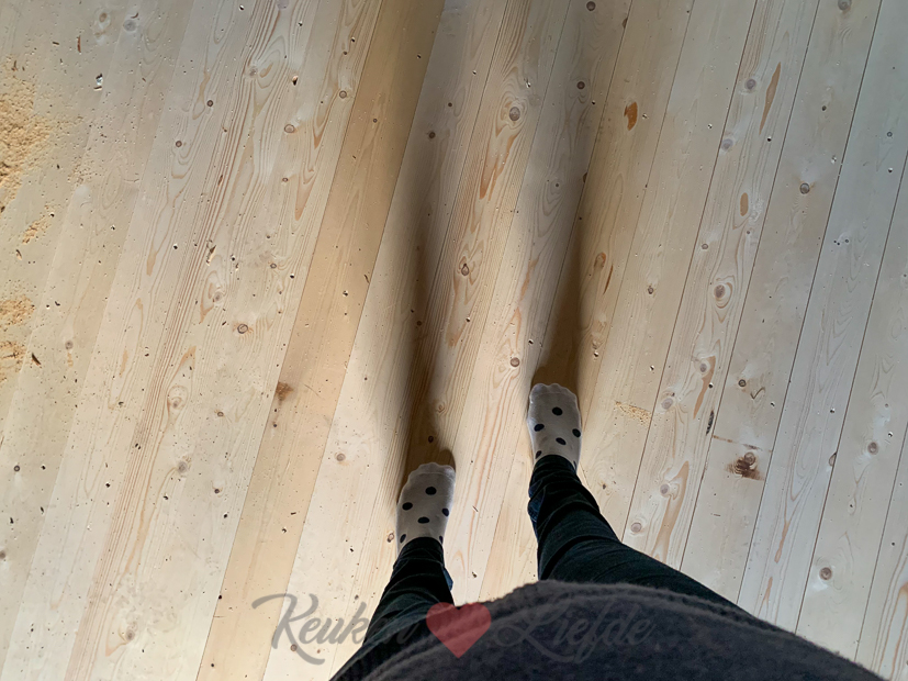 Na het koken neem ik een kijkje boven op de deel. Het nieuwe plafond (of de vloer, ligt eraan vanaf waar je het bekijkt ;)) ligt erin en de houten draagbalk die in het midden van de kamer zat is verplaatst naarboven. Dit moet straks onze slaapkamer worden…