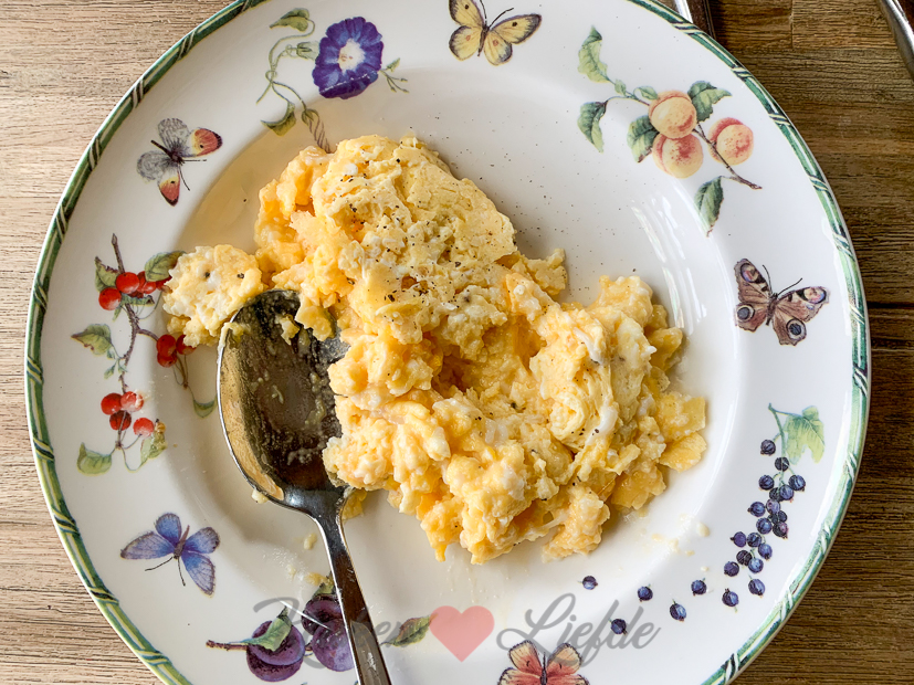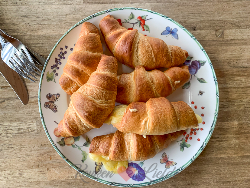 Ontbijten met croissantjes en roerei.