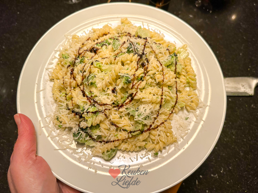 Het weekend is weer voorbijgevlogen. De wekker gaat ’s ochtends om kwart voor zes. Als Johan en Ella de deur uit zijn ga ik met een kop cappuccino achter de computer zitten. Ik heb vandaag een kantoordag en stiekem vind ik dat wel fijn. Mailtjes beantwoorden, recepten bedenken, recepten uitwerken, foto’s bewerken, etc. etc. Tussendoor draai ik een paar wasjes, want na het weekend puilen de wasmanden altijd uit. Voor het avondeten maak ik pasta met broccoli en kaassaus. Normaal doe ik daar ook spekjes doorheen maar die was spoorloos verdwenen. Die spekjes geven de pasta net wat meer smoel, maar gelukkig was daar balsamicostroop om de boel een beetje op te pimpen.