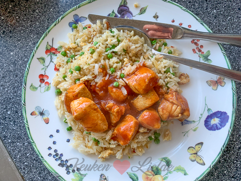 ’s Avonds maak ik een grote pan nasi goreng en kip in pangangsaus. Ik gebruikte de pangangsaus uit dit recept die ik mengde met gebakken kipfilet. ?!