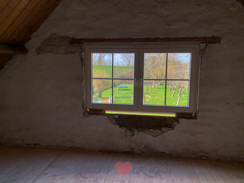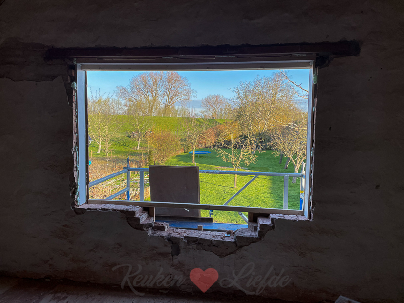 Boven de deel op de verdieping wordt een gat uitgehakt en een raamkozijn erin gezet. Hier willen Johan en ik straks onze slaapkamer maken. Geen verkeerd uitzicht toch? Het lijkt wel een schilderij…