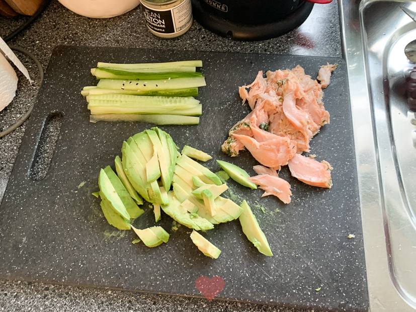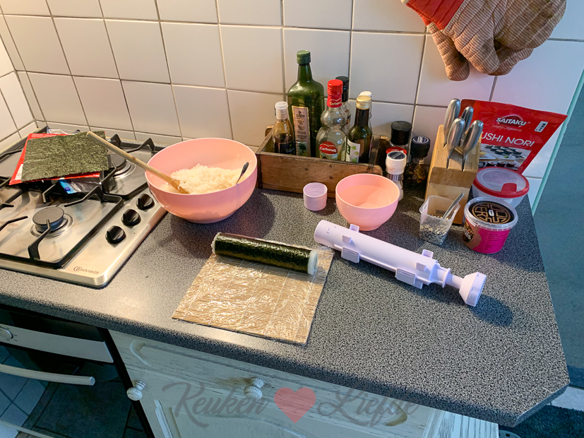 Omdat we nog behoorlijk wat zalm overhadden maak ik sushi voor het avondeten. Ik maakte in totaal 6 rollen sushi waarvan 4 met zalm en 2 met gerookte kip. Met de sushi-bazooka zijn de rollen zo gemaakt!