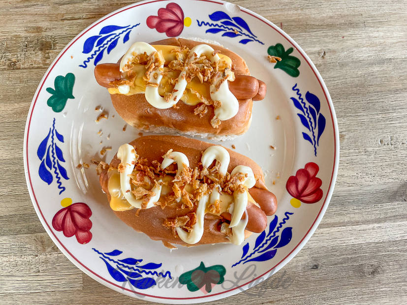 Ella-Marie eet een broodje hotdog voordat ze naar voetbaltraining gaat.