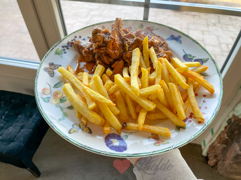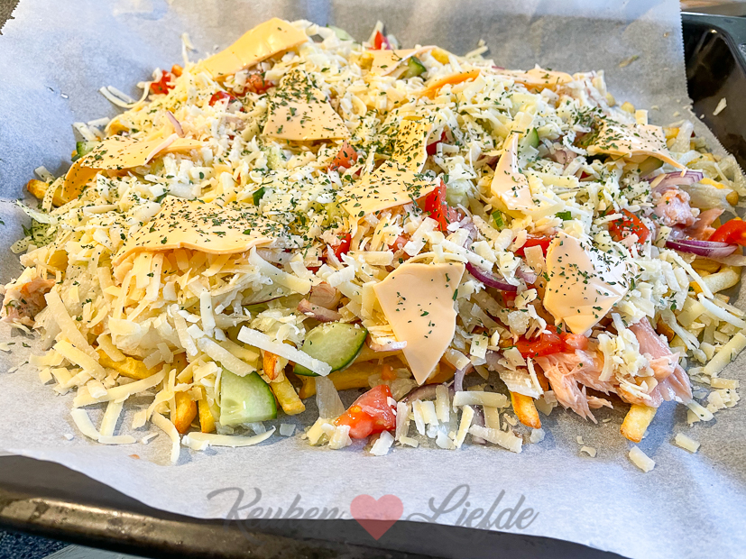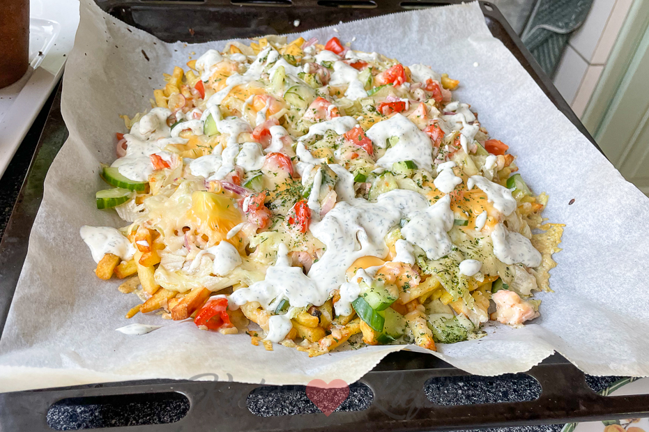 Voor het avondeten maak ik een kapsalon van de bakplaat met zalm. Johan deelde op IG een stories met de vraag of jullie hiervan het recept zouden willen….