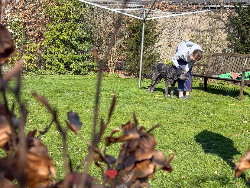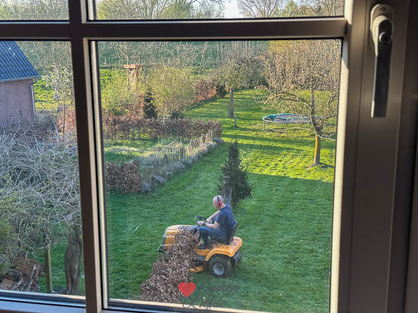 Als Johan en Ella ’s middags weer thuis zijn gaat Ella Nacho wassen. Ze was gisteren met hem naar het waalstrandje geweest en omdat hij het water was ingegaan stonk hij als een rotte vis. Johan gaat ook nog een paar uurtjes de tuin in en maait het gras voor de eerste keer dit jaar. De tuin ziet er dan meteen weer een stuk netter uit!