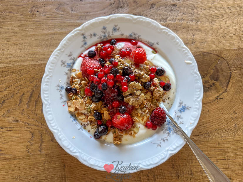 Ik begin de dag met mijn favoriete ontbijt: Griekse yoghurt met granola, vers fruit (diepvries dit keer), walnoten en honing. Zo lekker! Daarna heb ik urenlang een verzadigd gevoel waardoor ik alle tussendoortjes laat staan. Na het ontbijt ga ik een paar uurtje achter de computer zitten om te werken en ’s middags ga ik aan de slag met een nieuw recept: de ratatouille traybake!