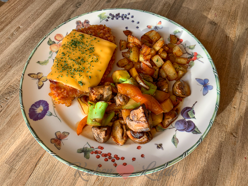Vandaag maakt Johan het avondeten klaar: gebakken aardappels, gebakken kipschnitzel met een plakje smelt cheddar en groenten uit de braadslee in teriyakisaus.