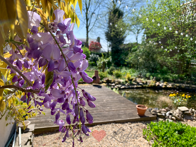 Deze blauwe regen die tegen ons huis groeit, hadden we vorig jaar flink teruggesnoeid. Gelukkig loopt hij nu weer uit. Kijk hoe mooi die kleuren zijn!