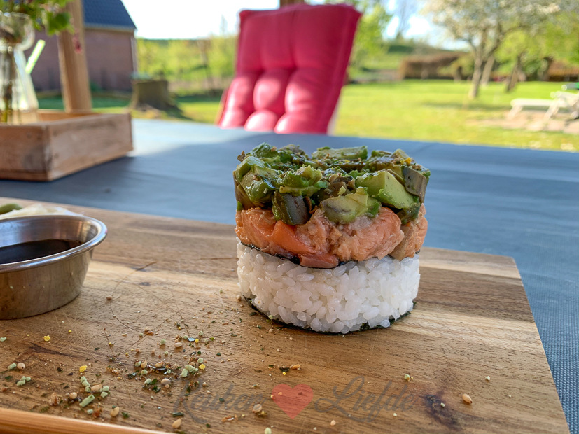 Hoi Ingrid, sushitaartje is heel simpel. Gewoon sushirijst koken volgens de bereiding op het pak en op smaak brengen met sushiazijn. Een stukje zalm mi-cuit garen in sojasaus en dan lostrekken met een vork. Avocado in plakjes snijden of prakken. In een kookring op maat geknipt norivel leggen, dan sushirijst, dan weer een norivel en dan zalm en avocado. Serveren met sojausaus, wasabi, ingelegde gember en eventueel wat furikake. Zal het recept binnenkort nog wel een keer maken en het uitschrijven en delen. 🙂