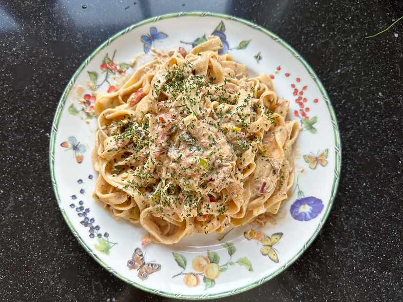 Tijdens het koken staat de tv aan want Johan ‘zijn club’ moest voetballen. Ondertussen maakte ik tagliatelle met kruidenroomkaas en tonijn. Dit recept. Een van onze favoriete pastagerechten op dit moment. Zo lekker!