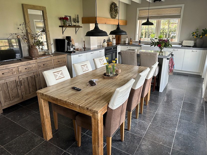 We ruilden de nieuwe tafel en grote nieuwe stoelen om met onze oude tafel en kleinere stoelen in de keuken. We hebben nu meer ruimte en kunnen met meer mensen in de keuken zitten.