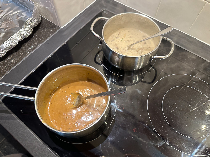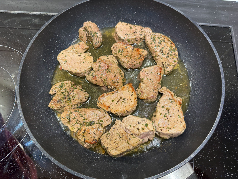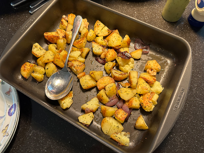 Ella heeft vandaag een voetbalwedstrijd thuis en terwijl zij op het voetbalveld staat zijn Johan en ik thuis aan het rommelen. Er wordt hout gehaald en er worden weer een paar meubelstukken verplaatst. ’s Middags rijden we nog even naar het tuincentrum en halen we boodschappen. Weer thuis begin ik alvast met de voorbereidingen voor het avondeten. Ik schil aardappels en pel een rode ui en doe die alvast met een klein bodempje kippenbouillon, een royale scheut olijfolie, rozemarijn en tijm en zout en peper in een braadslee. Ook snij ik twee varkenshaasjes in medaillons en kruidde die met salie, basilicum, peterselie, gemberpoeder, citroengraspoeder, korianderpoeder en zout en peper. Scheutje zonnebloemolie erbij, goed mengen, afdekken met vershoudfolie en in de koelkast bewaren. Daarna maak ik champignonroomsaus volgens dit recept. Voor Ella had ik peperroomsaus in huis gehaald want die houdt niet zo van champignons. En tot slot maak ik een honing-mosterddressing (grootste deel milde olijfolie, iets minder zoetzuur augurkennat en gelijke delen honing en mosterd) voor over de salade die Johan ’s avonds maakt. Voordat we gaan eten ’s avonds wordt er eerst een aperitiefje gedronken bij de houtkachel. De aardappeltjes worden gebakken in een voorverwarmde oven op 200 graden circa 30 minuten, of tot ze goudbruin zijn. Halverwege de tijd zal de bouillon verdampt zijn en kunnen de aardappeltjes goudbruin kleuren. Schep ze halverwege een keer om. Als de aardappels bijna goed zijn bak je de varkenshaasje met wat olie in de koekenpan en warm je de sauzen op. Aardappels, vlees en saus serveren met de salade en dressing.
