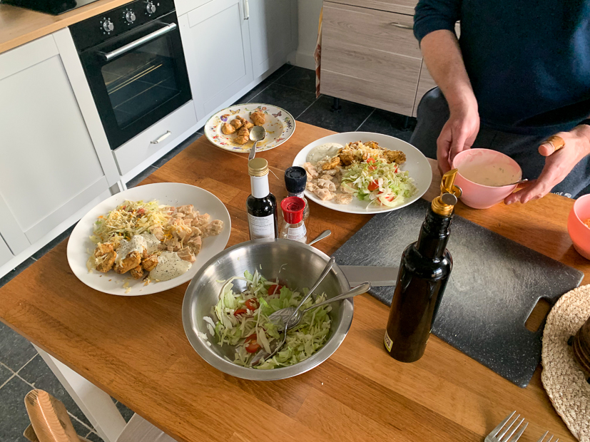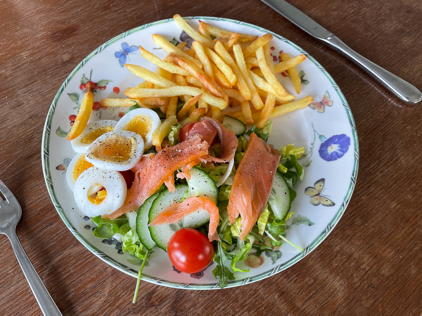 - Ons avondeten: salade met gerookte zalm en frietjes uit de airfryer