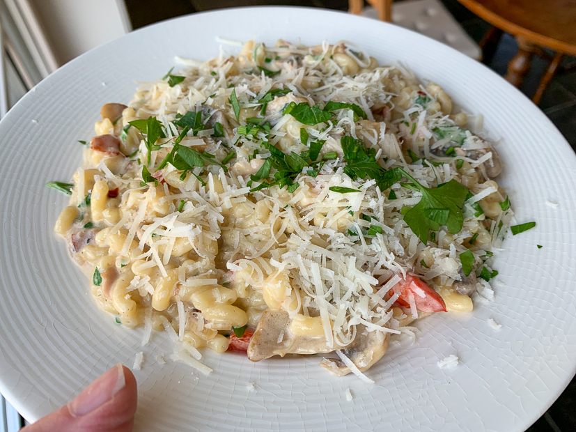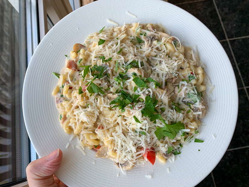Ella-Marie eet ’s avonds iets eerder dan ik en Johan en krijgt een paar gebakken krieltjes met chipolataworstjes en gekookte sperziebonen. Johan en ik eten ’s avonds macaroni met champignons, paprika en roomsaus. Alle kliekjes weer opgemaakt en iedereen lekker gegeten.