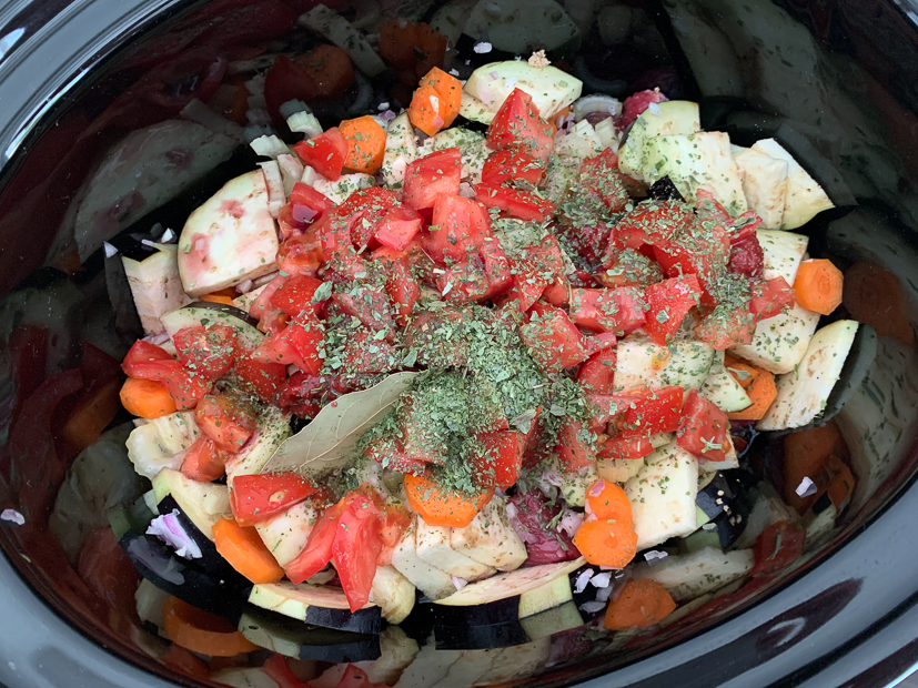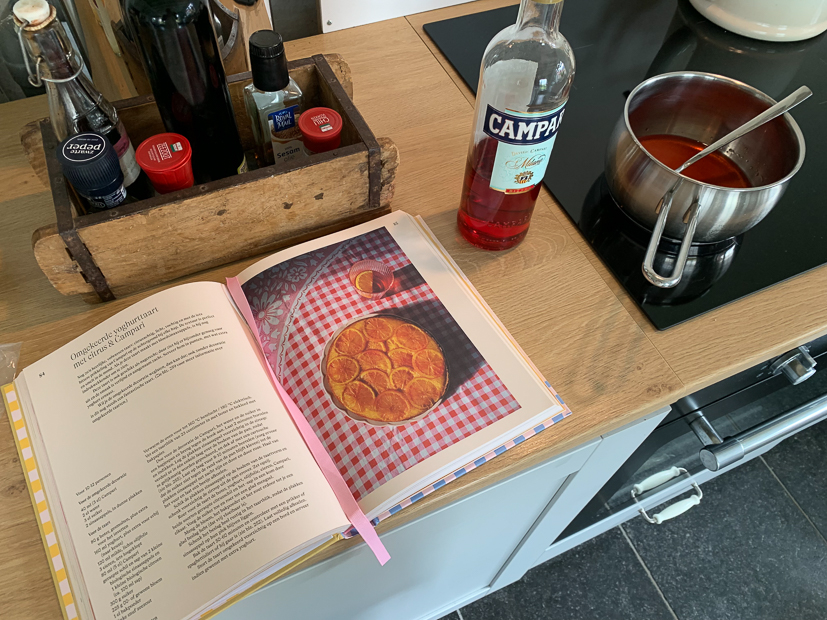 Johan rijdt ’s ochtends naar de meneer die onze keuken gaat maken om staaltjes op te halen van de keukenkastjes. We twijfelden tussen twee tinten wit en mat of glans. Uiteindelijk hebben we gekozen voor keukenkastjes in RAL 9010 in matte kleur. Johan stuurt ook nog een foto door van onze wasbak die al klaar ligt. Heel blij mee. Waar ik minder blij mee ben is een door onze kater Puk aangevreten taart die op het aanrecht staat en die ik vandaag nog op de foto moet zetten. Nee, onze katten mogen niet op het aanrecht komen en zijn ook nooit alleen in de keuken, maar als er onverhoopt toch één (altijd Puk) de keuken weet in te glippen, tja… Dan maken ze er een feestje van. Deze taart stond onafgedekt op het aanrecht omdat hij volledig moest afkoelen voordat ik hem kon afdekken. Gelukkig was het een upside down cake dus kon ik hem alsnog op de foto zetten. En natuurlijk werd er ook een stukje van de goede kant geproefd. Mmmm, heerlijk! Daarna snijd ik vlees en groenten en gooi dat bij elkaar in de slowcooker. Dat is alvast het avondeten voor morgen. Vanavond eten we shoarma dat ik al eerder had gemaakt en had ingevroren. Ondertussen dat ik in de keuken bezig ben is Johan in de tuin aan het werk en is Ella in de vijver aan het vissen. Arme visjes. Uiteindelijk weet ze 3 kleine visjes te vangen en stopt die in een kom met wat keien, waterplantjes en vijverwater. Een rondje door de zijtuin vertelt me dat er werk aan de winkel is. Als er onverhoopt een keer geen recept verschijnt op KeukenLiefde, dan ben ik waarschijnlijk onkruid aan het wieden…