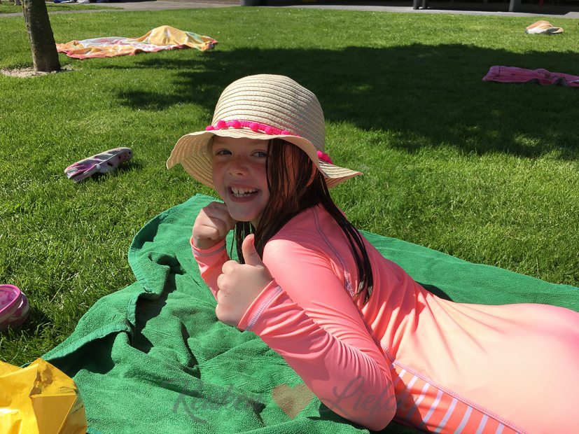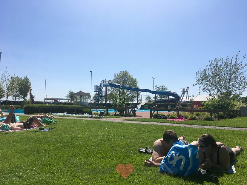 Terwijl Johan onze buxus te lijf gaat met buxusmotverdelger (onze nu nog prachtig groene buxus barst van de groene rupsen!), rijden Ella-Marie en ik naar het buitenzwembad in Dreumel. Het water is nog erg koud, maar dat mag de pret niet drukken. We vermaken ons prima.
