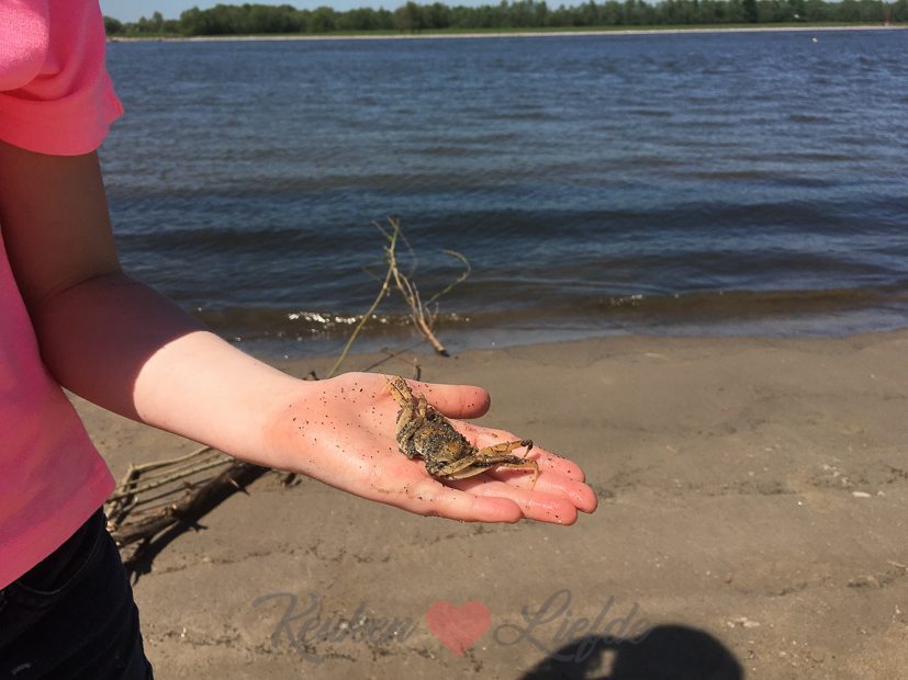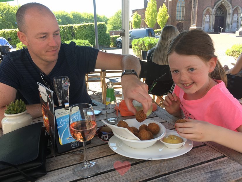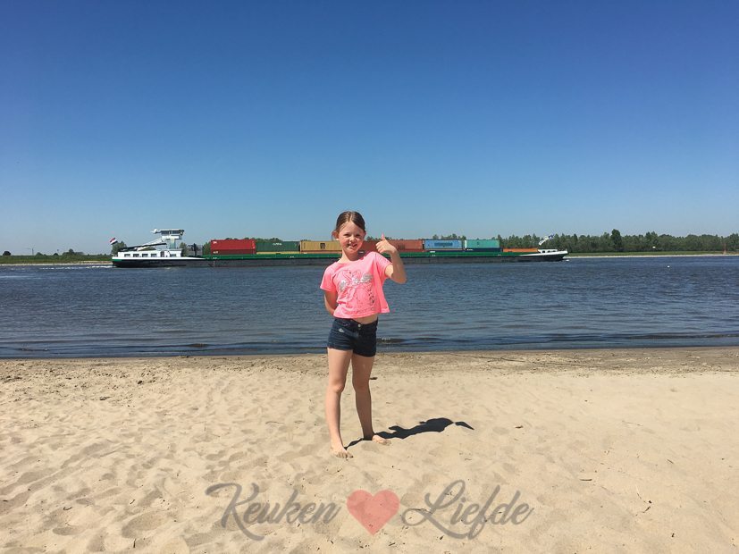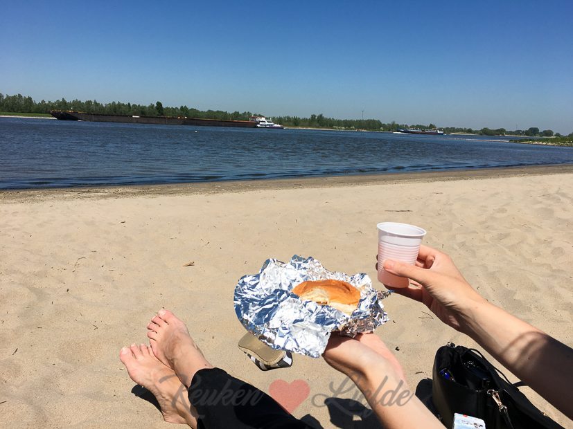 Daarna hervatten we onze fietstocht en fietsen over de dijk naar Dreumel. Daar ontdekken we nog meer mooie zandstrandjes waar we ook weer even stoppen om pootje te baden en wat te drinken. Daarna fietsen we het dorp Dreumel in om weer even een glimp van ons toekomstige huis op te vangen — we zijn er zó verliefd op! Ik vergeet steeds om een foto van het huis te maken, maar binnenkort doe ik dat en zal ik hier een glimp met je delen. 🙂 In het dorpscentrum strijken we neer op het terras Bij Jan om te genieten van een drankje en een portie bitterballen.