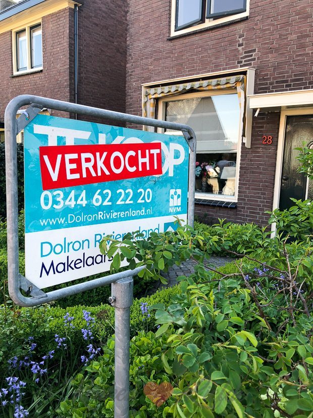 De makelaar plakt de sticker ‘verkocht’ op het te-koop-bord bij ons in de tuin. Eindelijk is het officieel! 🙂