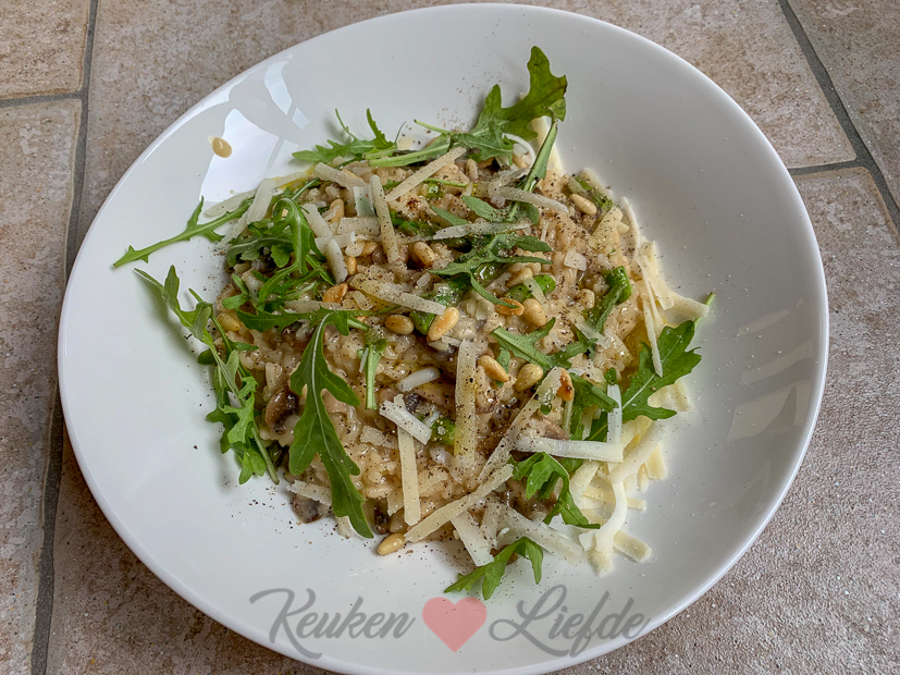 Ik maak risotto met champignons en groene asperges. Misschien wel de lekkerste risotto ooit…! Hoe je hem maakt? Pijnboompitjes goudbruin roosteren in droge koekenpan, opzij zetten. 400 gram champignons (plakjes) bakken op hoog vuur in olijfolie en boter, op het laatst wat tijm (heel takje) en teentje uitgeperste knoflook erdoor roeren, meegaren en van het vuur afhalen. Takje tijm eruit halen. In dezelfde pan gesnipperd uitje, uitgeperste knoflookteen en gedroogde chillivlokken aanfruiten in olijfolie. Afblussen met witte wijn en laten verdampen. Half pak risotto erbij en even doorroeren. Onderzetten met bouillon (ik gebruikte één pot kippenbouillon van de Soepfabriek aangevuld met zelfgemaakte kippenbouillon gemaakt met een bouillontablet) en zachtjes laten pruttelen, al roerend en steeds wat extra bouillon toevoegen tot de risotto beetgaar is. Dit duurt een minuut of 20. Ondertussen 100 g groene aspergetips in stukken snijden van ca. 1 cm. Klont roomboter, flinke eetlepel crème fraîche, flinke hand geraspte Parmezaan, groene asperges en gebakken champignons erbij, doorroeren en nog kort (1 à 2 minuten) doorwarmen. Dan vuur uit, deksel op de pan en 2 minuten laten staan. Opscheppen, wat rucola, pijnboompitten en een draai zwarte peper uit de molen eroverheen en smullen maar!