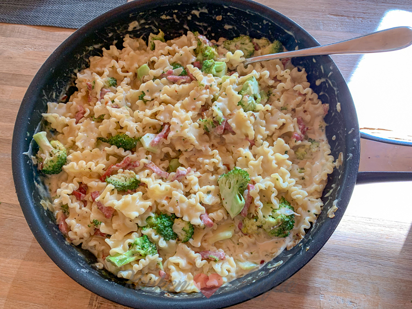Voor het avondeten maak ik pasta met romige kaassaus, bacon en broccoli. Mmmm… Ik maakte ongeveer dit recept.