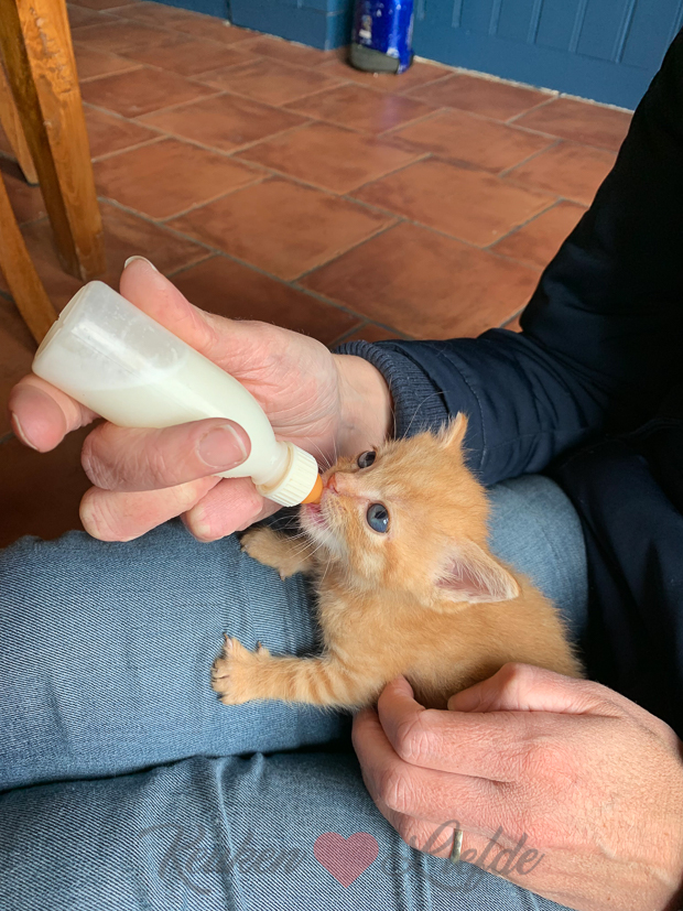 - Onze kleine Puk, hier mag ik hem bijvoeren met het flesje want hij groeit nog niet zo hard.