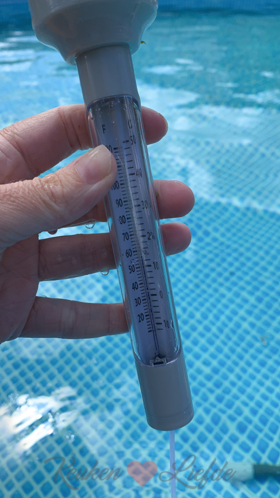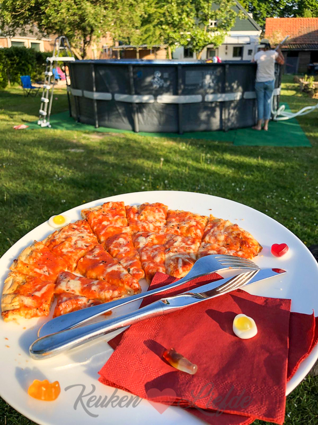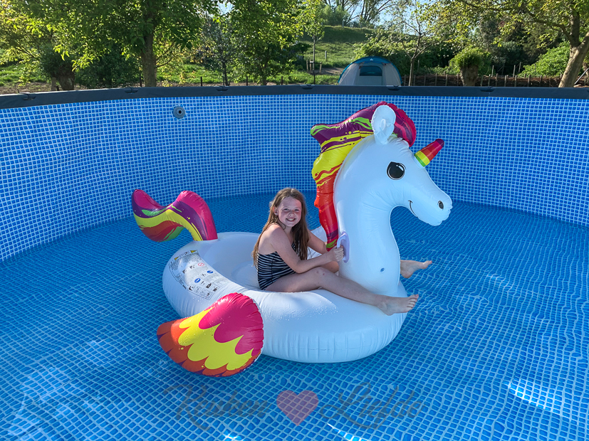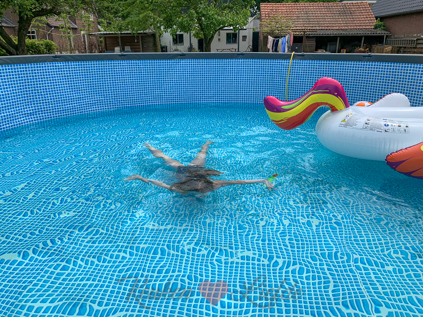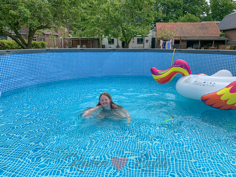 Daarna wordt er nog een keer geplonst in het inmiddels half gevulde zwembad. Nog even genieten want morgen wordt het koud!