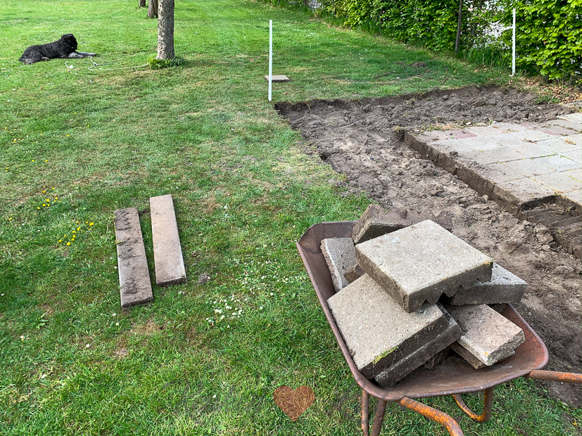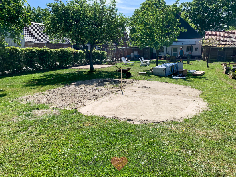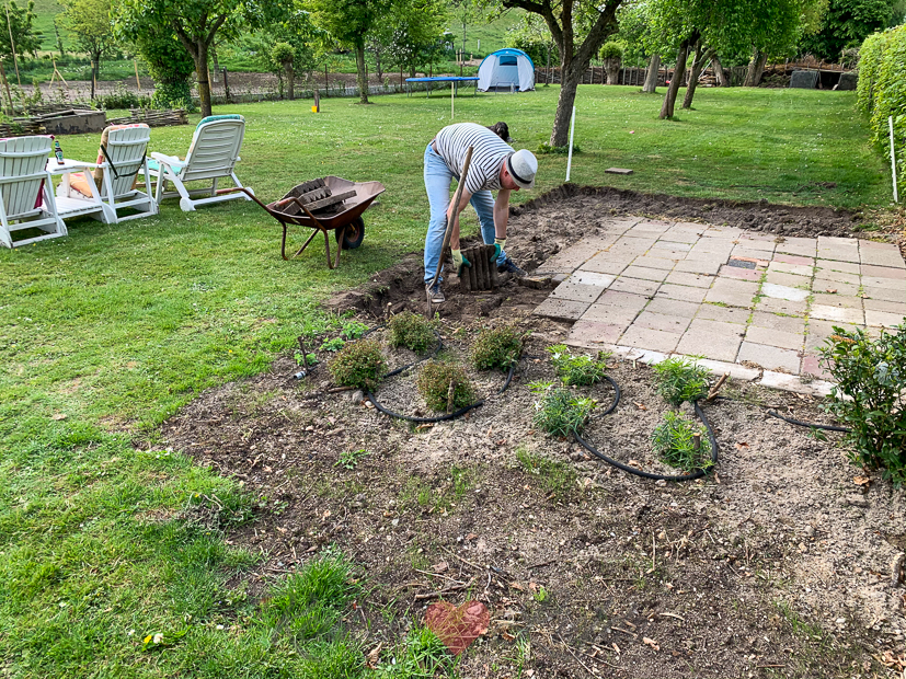 Na het koken ga ik de tuin in om Johan te helpen. Op de plek waar vorig jaar nog een oud kippenhok stond willen we een terras maken. Johan is druk bezig om de oude tegels eruit te halen, schoon te maken en de grond gelijk te maken. We gebruiken dezelfde tegels om het terras weer opnieuw te bestraten.