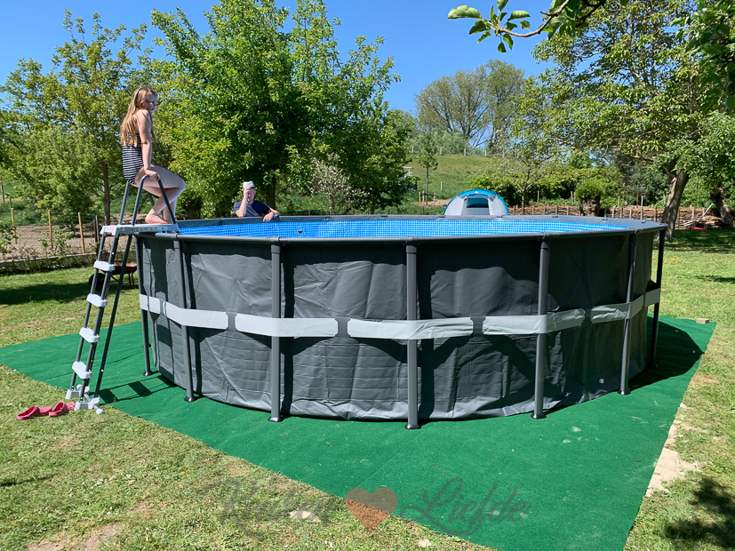 Tot grote blijdschap van Ella-Marie besloten Johan en ik (na lang wikken en wegen) een opzetzwembad te kopen. Hij werd deze week thuisbezorgd en vandaag willen we hem opzetten. Johan zijn ouders komen langs om te helpen.