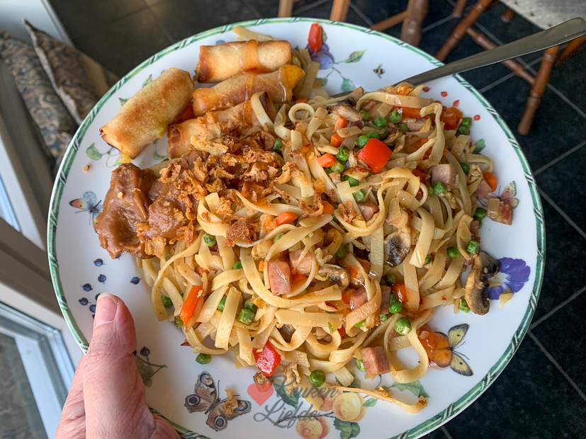 Ella en ik gaan samen een dagje shoppen in Den Bosch. Bij La Place halen we een lekker broodje voor de lunch en daarna halen we bubble tea: een gezoet theedrankje met melk (kan ijskoud of warm) en gekookte tapiocaparels. Op KL vind je (nog) geen recept hiervoor. Moet ik hier een recept voor delen? Laat maar weten in een reactie hieronder. Na het dagje winkelen zet ik Ella af bij opa en oma om een paar nachtjes te logeren. Als ik thuis ben is Johan inmiddels ook thuis. Gelukkig hoef ik niet te koken want er is nog bami van maandag over. We eten er mini-loempiaatjes uit de oven bij.