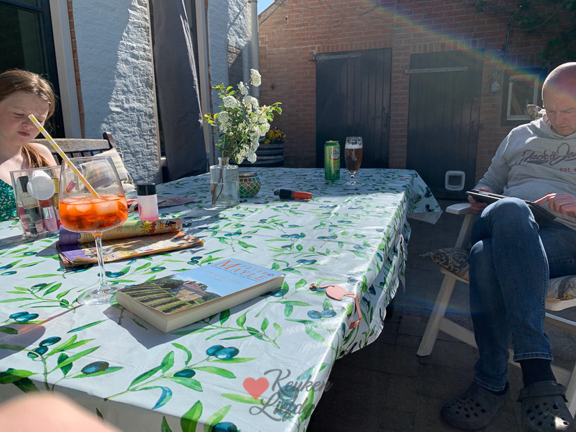 Pfffff, was wel weer even wennen hoor, die wekker zo vroeg. Maar gelukkig is iedereen er op tijd uit en vrolijk gezind. Nadat Johan en Ella de deur uit zijn, trek ik me terug op kantoor. Tussendoor draai ik wat wasje en hang ze buiten op. Van mij mag het de hele zomer dit weer blijven! (Hoewel een paar buien voor de tuin ook wel welkom zijn.) Tussen de middag eet ik buiten in het zonnetje twee bruine broodjes op terwijl ik een stukje verder lees in het boek A Good Year (je kent de film wellicht?). Heerlijk boek! Daarna ga ik nog even aan het werk en maak ik een pannetje broccolisoep voor Johan en Ella. Die eten iets eerder vanavond omdat Ella voetbaltraining heeft en Johan aan de beurt is om de trainer te assisteren. Als ze weg zijn maak ik aspergerisotto met ham en een gepocheerd ei voor mezelf klaar. Ik had al zolang zin in asperges maar helaas maak ik Johan en Ella er niet zo blij mee. Ik wilde ze eigenlijk op de klassieke wijze eten met krieltjes en hollandaisesaus maar had geen zin om allemaal pannen vies te maken voor mezelf en dus werd het risotto. Was smullen.