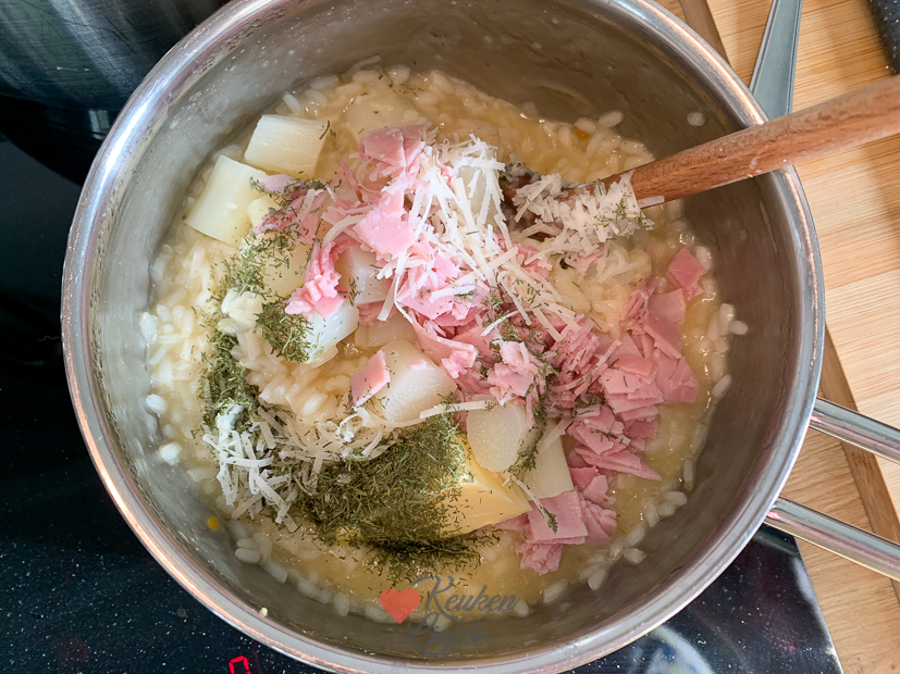 Hoi Laura, geen recept van maar heel simpel. Geschilde asperges in ruim water beetgaar koken en uit de pan scheppen. Aspergeschillen en afsnijdsels aan kookwater toevoegen en nog een kwartiertje zachtjes laten trekken (kan al dag van tevoren). Uitje met knoflook zachtfruiten in olie en klontje roomboter. Risotto erbij en omroeren. Afblussen met scheutje droge wijn en laten verdampen (of laat dit achterwege). Dan verkruimelde bouillontablet (kip of groente) erbij en kookvocht van asperges erbij. Al roerend de risotto beetgaar koken, duurt een minuut of 20. Niet droog laten staan, dus steeds opnieuw kookvocht toevoegen als vorige verdampt is. Als risotto beetgaar is klont roomboter, hand geraspte parmezaan, dille (gedroogd of vers), gesneden beenham en in stukjes gesneden asperges erdoor roeren. Op smaak brengen met zwarte peper uit de molen. Ik serveer het met een gepocheerd eitje. 🙂