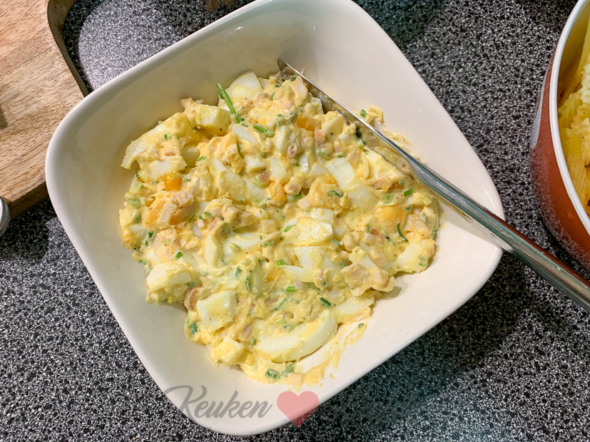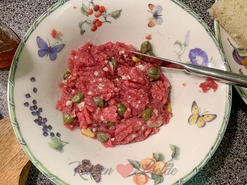 We hebben ’s avonds geen zin meer om te koken en besluiten een klein borrelplankje te maken met zelfgemaakte eiersalade (met gerookte kip erdoor) en deze carpacciotapenade. We smikkelen de hapjes op voor de tv op en kijken ondertussen de film Beverly Hills Cop 2.