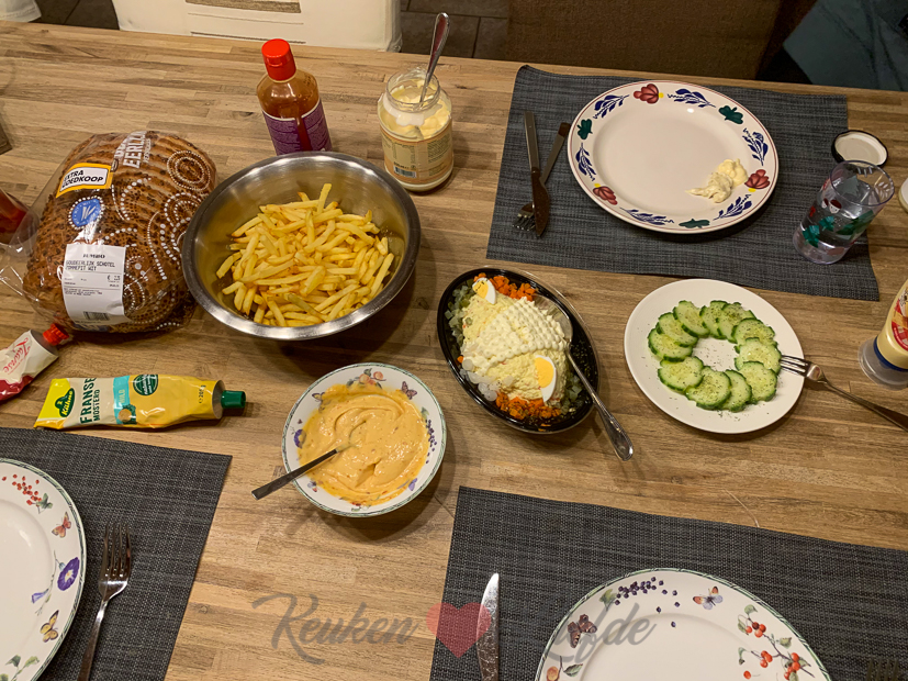 ’s Avonds eten we van alles wat we nog in huis hebben. We gooien frietjes en kroketten in de airfryer, trekken een eischoteltje uit de koelkast, snijden wat komkommers en klaar zijn we weer.