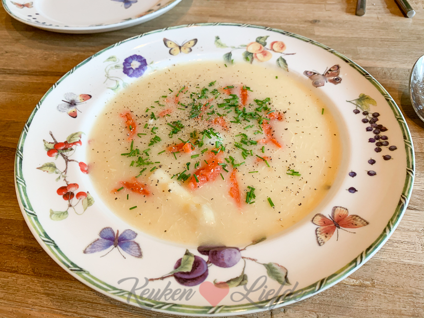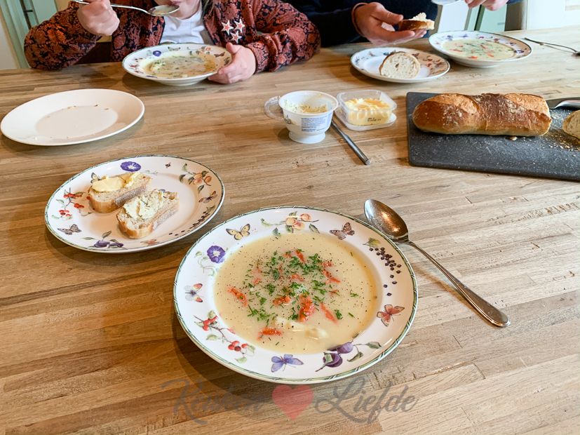 Ella-Marie en Johan zijn weer naar school en kantoor dus ik ben vandaag alleen thuis. Ik zit voornamelijk op kantoor om mail te beantwoorden, gekookte recepten uit te schrijven en foto’s te bewerken. Als ik klaar ben ga ik de keuken in en maak alvast aspergesoep voor het avondeten. Op dinsdag moeten Johan en Ella-Marie op tijd eten, omdat Ella ’s avonds voetbaltraining heeft. Johan is tijdelijk de trainer van haar team dus moeten ze op tijd weg. Ik maak aspergesoep met gerookte zalm en bieslook en erbij serveer ik stokbrood met kruidenboter.