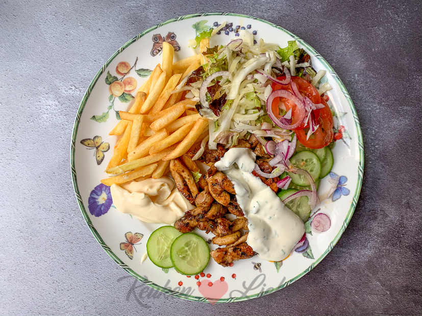 Ik heb geen idee wat ik ’s avonds moet koken. In de koelkast liggen nog kippendijen, pitabroodjes, sla en wittekool dus shoarma it is! Ik snijd de kippendijen in reepjes en laat ze marineren in een zelfgemaakte kruidenmarinade. Van een stukje wittekool, sla en ui maak ik een salade en ik maak wat knoflooksaus op yoghurtbasis. Erbij bakken we frietjes. Was weer smullen!