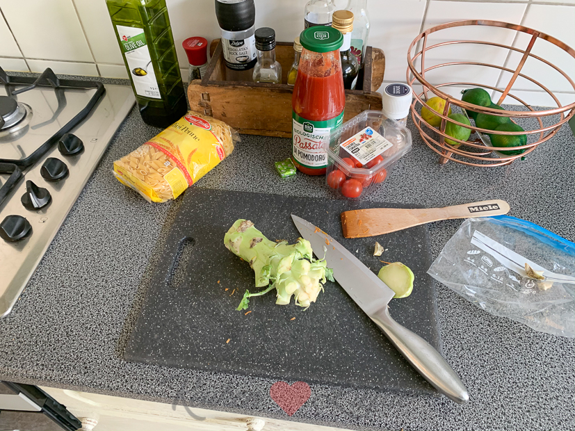 - Ik vond nog een broccolistronk in de koelkast dus die mag ook in de lasagne. Wel eerst goed schillen.