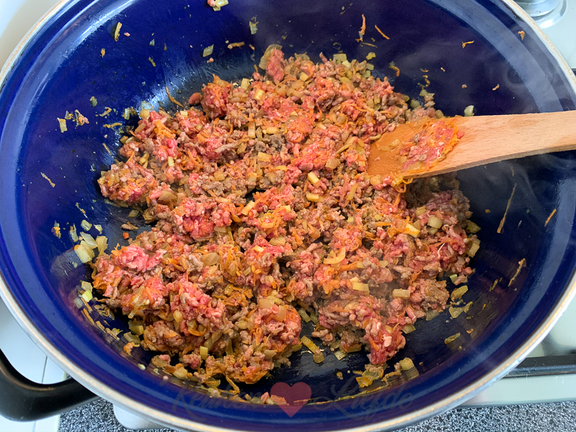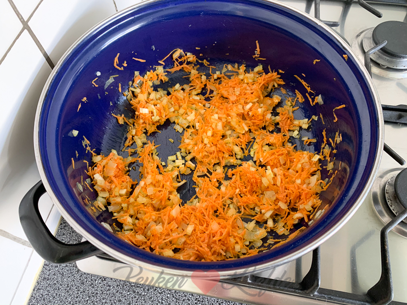 - Uitje en knoflook fruiten, dan geraspte wortel en bleekselderij erbij