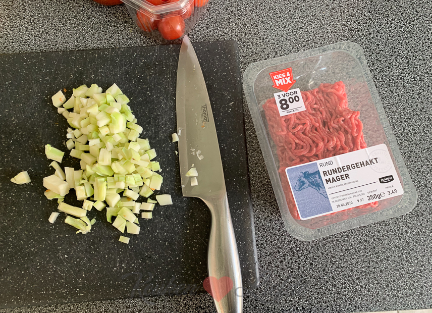 - Gemengd gehakt is lekkerder in dit gerecht, maar met mager rundergehakt kan het ook. Ik had ook nog een broccolistronk liggen. Die snijd ik fijn en mag er ook in.