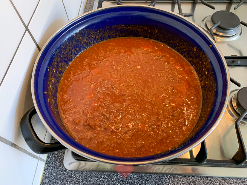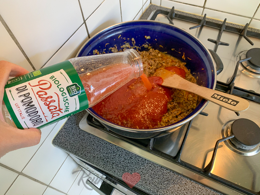 - Tomaten passata (lege fles omschudden met scheut water en dat ook aan de saus toevoegen) en verkruimeld runderbouillonblokje erbij
