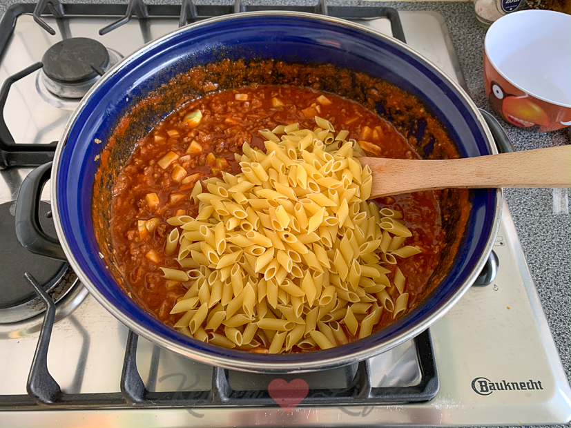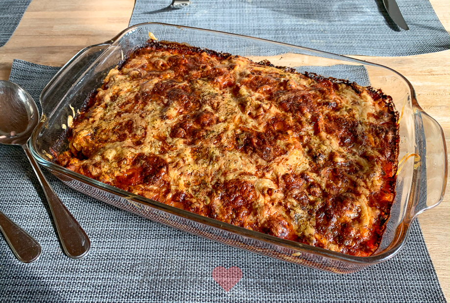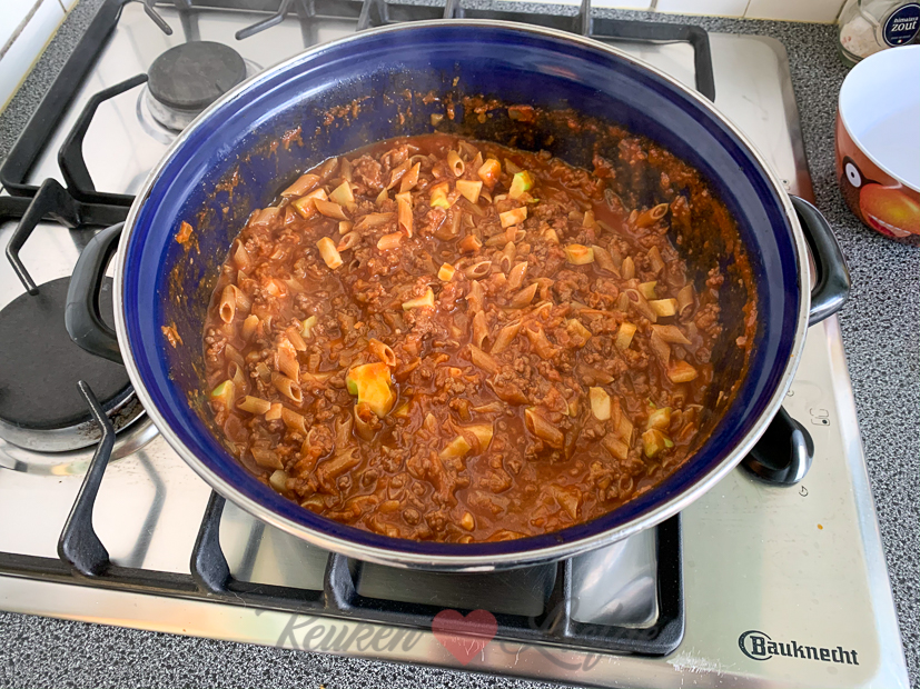 Omdat het kouder weer is heb ik zin in een hartverwarmende ovenschotel: lasagne! Tijdens het koken kom ik erachter dat ik geen lasagnebladen meer heb. Ik heb nog wel een zak mini penne liggen dus gooi ik die maar door de bolognesesaus.