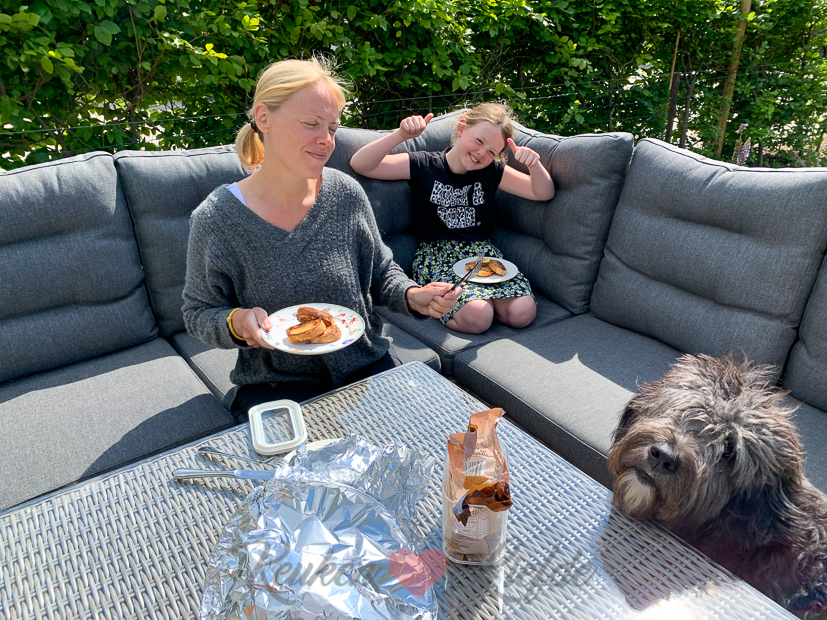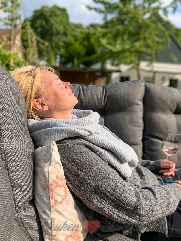 We rommelen de hele dag buiten in de tuin. Hier geniet ik nog even van een glas rosé en een paar zonnestralen voordat ik naar binnen ga om te koken.
