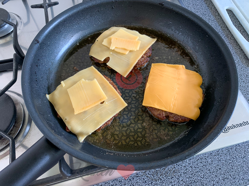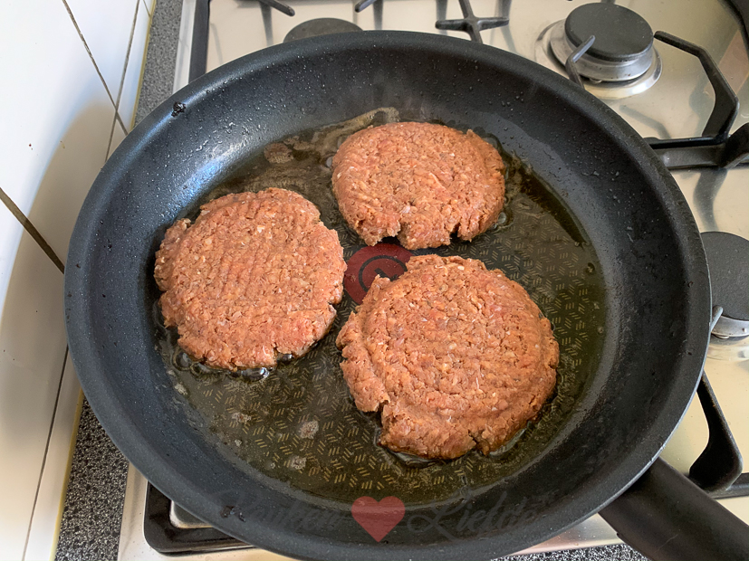 - Ik druk de hamburgers iets platter, dat eet makkelijker op een broodje